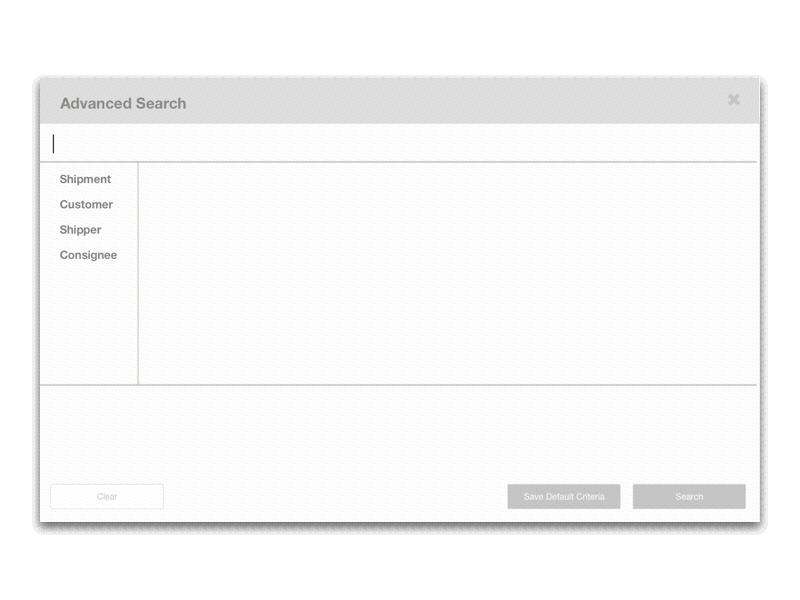 The early wireframes of the app followed a basic left nav structure, and used a 12 column style grid for the main content area. The main dashboard was very primitive for v1, but would still provide a high level overview of things like delayed shipments and potentially delayed shipments. I also created wireframes for some of the main features such as the advanced search and table column customization.