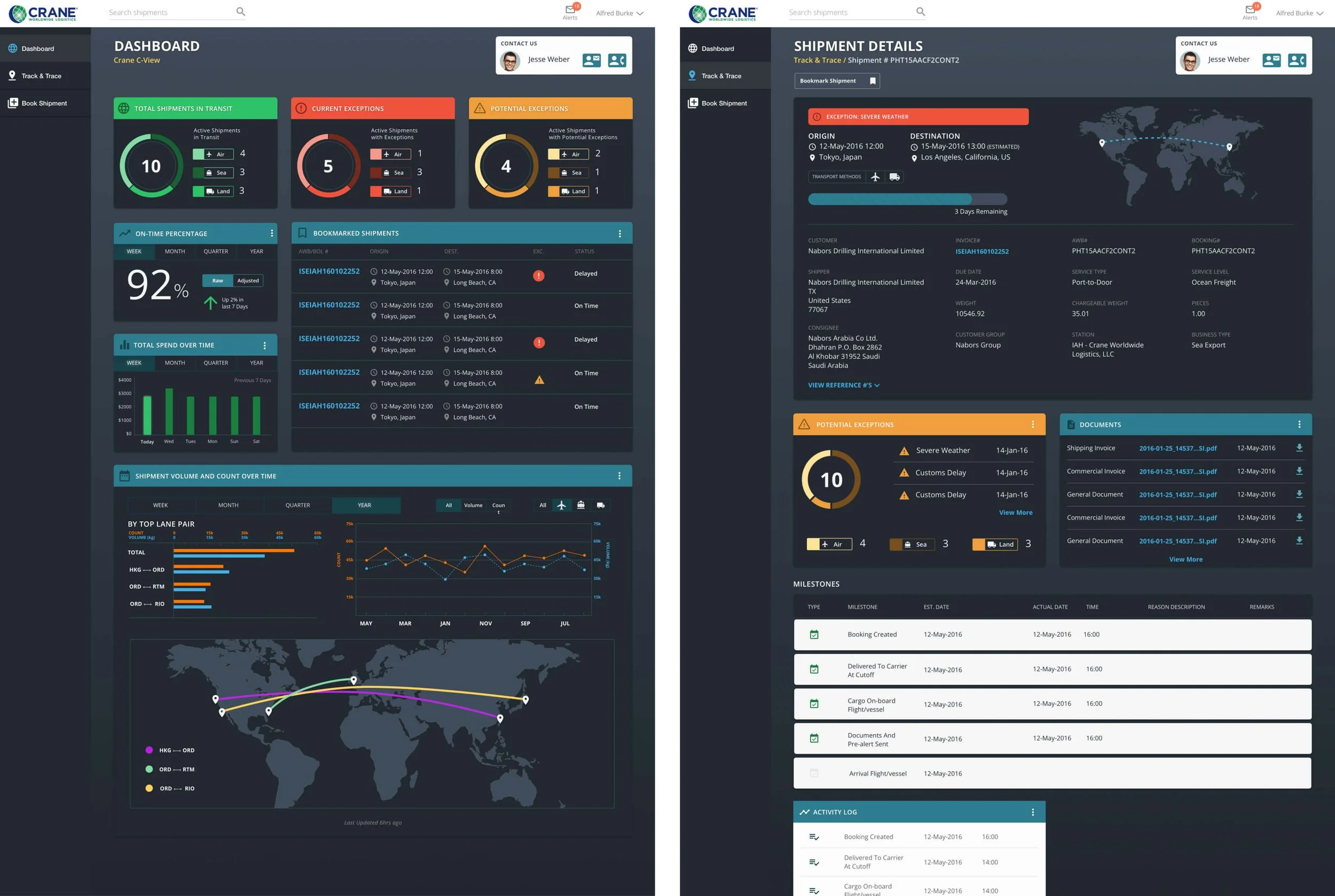 The initial concept that was created on a whiteboard was very chart driven, but did not do a great job of relaying data/information quickly. After some discussion and revisions, it evolved to scale-based visualization that used custom icons to signify shipment volume amounts.
